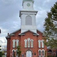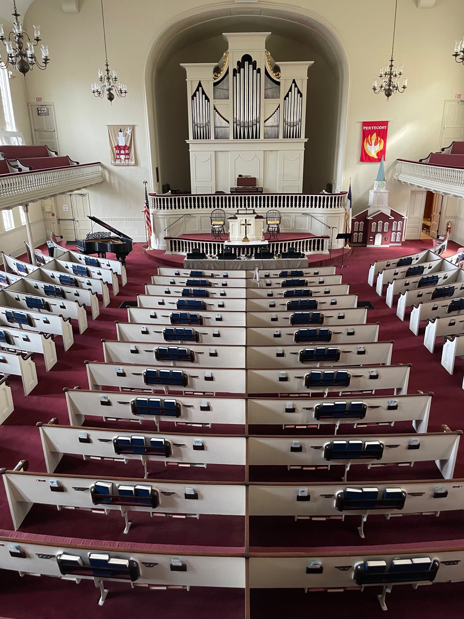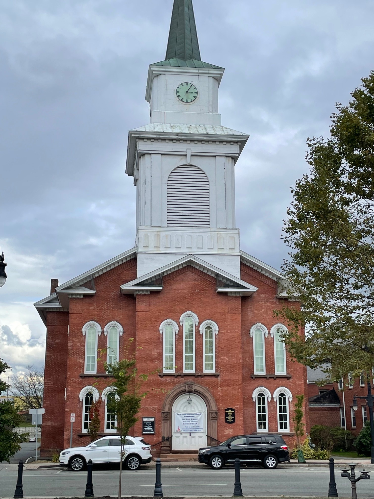 On October 18, I spent a couple hours with leaders at First Congregational Church in Westfield, Massachusetts (#44). I enjoyed hearing about an upcoming Halloween party for EVERYONE – kid-friendly food, candy, and games for all ages. A significant outreach to the community is the Blessed Buys Thrift Shoppe, occupying an adjacent building with rooms designated for books, household items, clothing, and more! A walk through the historic meetinghouse included a stroll through the balcony with impressive views of the pews and chancel. Windows at the front of the church provide a prime vantage point for looking out on the town square.